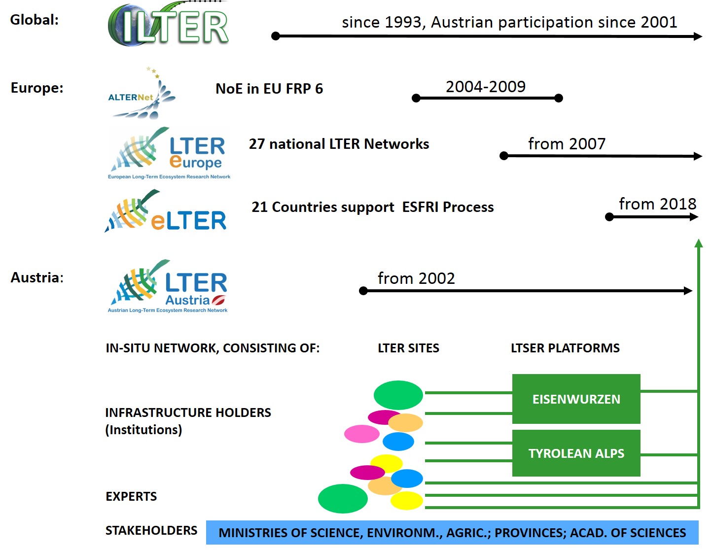 LTER-Austria was and is substantially contributing to the conceptual development of LTER and the progression of the LTER network on international level. Scientist from LTER-Austria not only were involved in the development of the LTSER concept. Austria also takes a leading position in the implementation of LTSER platforms. At the moment, the former head of LTER-Austria, Michael Mirtl (Environment Agency Austria), chairs LTER-Europe as well as the International Relations Committee of the global LTER network. One of his intentions on European level is to strengthen the position of LTER on its way to a European Research Infrastructure (eLTER RI). Austria was involved in the application of LTER for the Roadmap of the European Strategy Forum on Research Infrastructures (ESFRI).